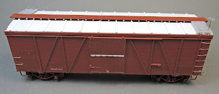 After letting the car body with the new end set overnight to allow glue to completely setup I added “B” end details. First I drilled all the holes using a #79 drill for grab irons and ladder rungs to be installed later. Once drilling of holes was complete, I installed a Tichy Train Group (Tichy) brake step and brackets from Tichy set #3013. Next I installed the brake shaft step using an A-Line #29000 sill step. A Sunshine Models retainer valve from the parts box was installed next followed by a retainer line, Tichy, #1100, .008" diameter PBW and brackets fabricated from Tichy, #1101, .010” diameter phosphor bronze wire (PBW). Now the brake shaft, Tichy #11026, .015” diameter PBW with a Tichy brake wheel, from set #3010, was installed. The longitudinal running board extension brackets, Evergreen,#8102, 1x2” strip styrene were attached. The grab irons and ladder rungs bent from Tichy, #1101, .010” diameter PBW ( see “bending grab irons”under “labels “ on this blog) were installed next. Finally, the uncoupling levers, Tichy, #1106, .0125" diameter PBW (see "bending uncoupling levers" under "labels" on this blog) with eyebolts bent from Ticy, #1101, .010" PBW for brackets were installed to complete the “B” end. Grab irons, ladder rungs and uncoupling lever and brackets on the “A” end we’re installed next.