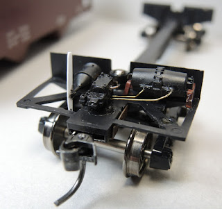 Resin running boards from the parts box were installed. Longitudinal running board extension brackets were made from Evergreen, #8103, 1x3” strip styrene. Prior to install, latitudinal running boards had mounting brackets cut from .005”x .030” shim brass glued to the back with extensions on the back side for gluing under the longitudinal running board and extensions on the front edge for bending over the roof edge. And, before install, I added corner grab irons bent from Tichy Train Group (Tichy), #1100, .010” diameter phosphor bronze wire (PBW) with Yarmouth Model Works shoulder eyebolts, YMW #356, for corner brackets. Installing the grab irons on the latitudinal running boards prior to install makes it easy to cut off any wire protruding through the back flush with the backside.